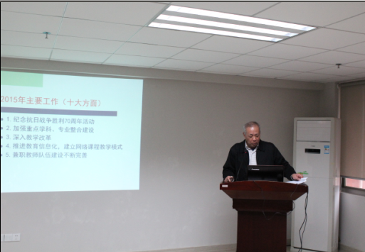 最后,陈玉川院长做了“2015年主要工作和2016年工作思考”的报告。他总结了2015年重点开展的十项工作,分别是:纪念抗日战争胜利70周年活动;加强重点学科、专业整合建设;深入教学改革;推进教育信息化,建立网络课程教学模式;兼职教师队伍建设不断完善;创新创业教育的开展;“强师工程”开展;推进学生管理体制改革;学术活动推进;校庆工作顺利完成。2016年工作思考要点分别是:应用型本科人才培养模式探讨;打造适应学生自主学习的校园公共服务;重点培养一批中青年学术骨干,活跃学校学术气氛,提高教学效果;加大实验室的改造与建设;学生思想教育要进一步加强。