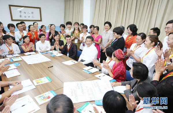 (2014年9月9日,习近平来到北京师范大学看望教师学生,向全国广大教师和教育工作者致以崇高的节日敬礼和祝贺。这是习近平同正在北师大参加“中小学教师国家级培训计划”的贵州小学骨干语文教师交流。新华社记者姚大伟摄)