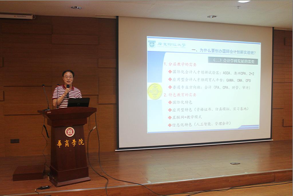 接着,华商学院副院长、会计学院院长陈美华教授从五个方面对ACCA进行了详细的阐述:为什么要创办国际会计创新实验班、为什么要选择ACCA、ACCA的培养目标是什么、ACCA创新实验区的办学方式是怎样的、ACCA的办学效果是怎样的。