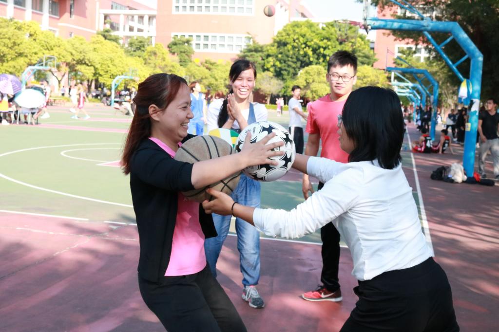午后的天气依然炎热,却丝毫没有影响教工们的参与热情,在支戈壁副院长的宣布下,教工活动比赛正式拉开帷幕!比赛分为4个项目,分别是:投篮接力、趣味组合、袋鼠接力跳、抱球接力跑。