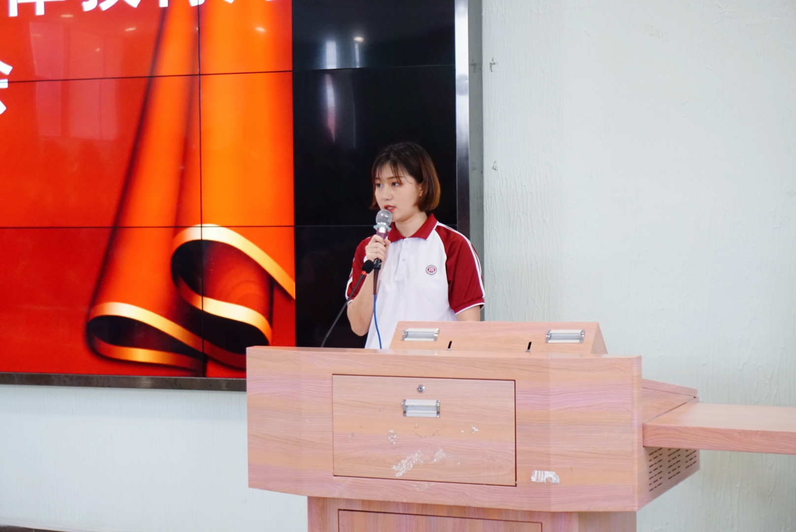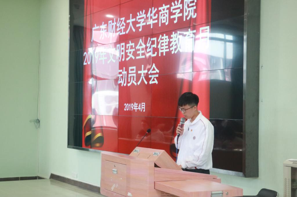 学生党员代表麦炜森同学讲话。作为大学生党员,麦炜森同学倡议,必须认真落实好学校文明安全纪律教育月有关工作,发挥党员的先锋模范作用。自觉遵守学校的规章制度,做到不违纪、不旷课、不早退、不带早餐、上课认真听讲,课后主动带走课室的垃圾,共同营造绿色文明课堂。带头遵守宿舍纪律,做好宿舍党员示范岗。