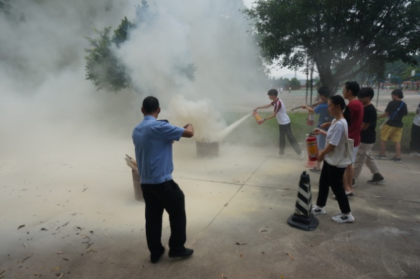 讲座结束后,物业公司消防领班张毅华向师生演示了灭火器的正确使用方法,同学们在实操现场进行了灭火器实操演习。