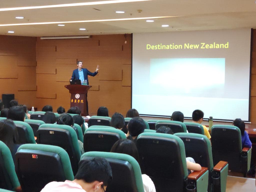 下午,Dr. Filep在鸭脖图书馆报告厅作了主题为“DestinationNew Zealand”(下一站,新西兰)讲座。他介绍了新西兰的旅游优势及新西兰旅游业的现状及未来发展。讲座现场气氛活跃,学生积极与教授提问和互动。