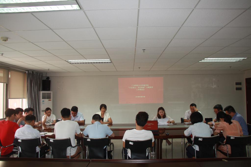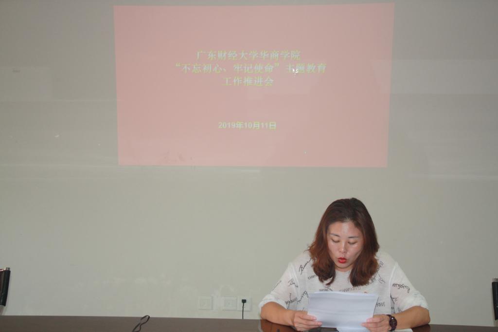 为传达学习中央和省委“不忘初心、牢记使命”主题教育会议精神和有关要求,总结前阶段工作,进一步安排部署学校主题教育工作,10月11日,鸭脖召开“不忘初心、牢记使命”主题教育推进会。广东财经大学华商学院“不忘初心、牢记使命”主题教育领导小组副组长、党委副书记、纪委书记、副校长王锦秀同志,主题教育办公室全体成员及各党支部书记参加了本次会议。