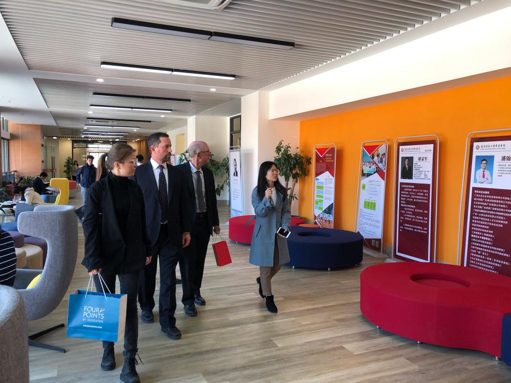 会谈结束后,美国汉弗莱斯大学来访代表团在鸭脖代表的陪同下参观了华商学院图书馆、跨专业仿真综合实习平台、大传播实验教学平台。