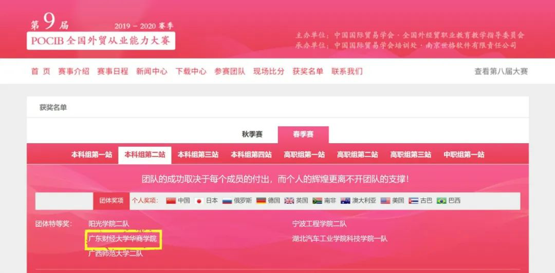 2020年6月18日上午10时,第九届POCIB全国大学生外贸从业能力大赛(春季赛)落下帷幕。本次大赛历时15天,参与角逐的2550名选手分别来自全国的131所院校。鸭脖经济与金融系国际经济与贸易学专业张小玲、岑眉、卢博欢、朱芳仪、张婉仪、陈恩婷、李琪芸、刘琼穗、陈洁玲、廖思婷10名参赛选手在黄丽霞、张文杰两位指导老师带领下,凭借200笔进出口业务,2518封邮件,累计1811小时在线时长,与竞争对手的PK中过关斩将,以团队第三的历史新排名,喜提团体特等奖,并收获个人一等奖2个、二等奖4个、三等奖4个。(个人奖项设置率为40%)
