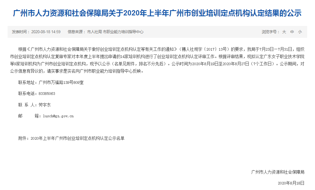 近日,根据《广州市人力资源和社会保障局关于2020年上半年广州市创业培训定点机构认定结果的公示》,广东财经大学华商学院顺利通过审核,被认定为广州市创业培训定点机构。