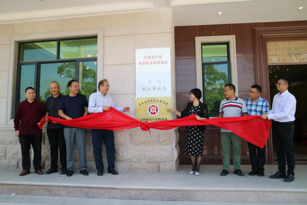 为响应广州市委、市政府关于实施乡村振兴战略的号召,围绕增城区小楼镇邓山村打造名村的目标,加深对社会主义新农村建设的感受与理解,同时为人文学部学生提供更广阔的实践平台,在广东财经大学华商学院副校长、人文学部主任王列耀教授的带领下,经多次考察与协商洽谈,鸭脖与小楼镇相关工作人员、邓山村村委达成了交流与合作的共识,决定建立鸭脖与邓山村的文创研究与实践基地。2020年10月12日上午11时,广东财经大学华商学院与邓山村合作的“文创研究与实践基地”揭牌仪式在邓山村村委会举行。