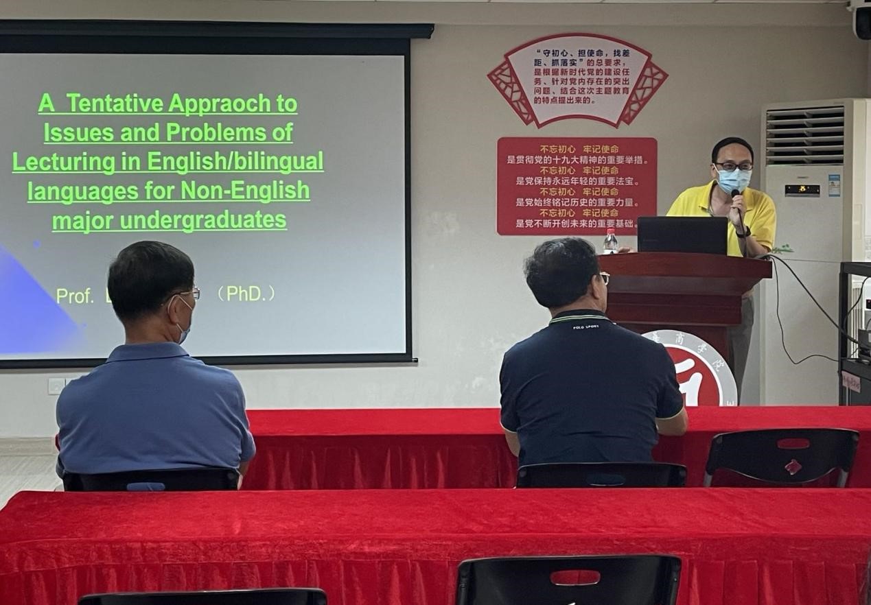 6月22日,鸭脖双语、全英教师培训系列讲座第三讲于行政楼502室举行。本次讲座由国际学院副院长黎平海教授主讲,钟森文副校长出席讲座,国际交流与合作处王文忠处长主持讲座。