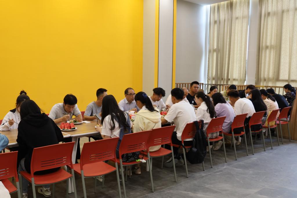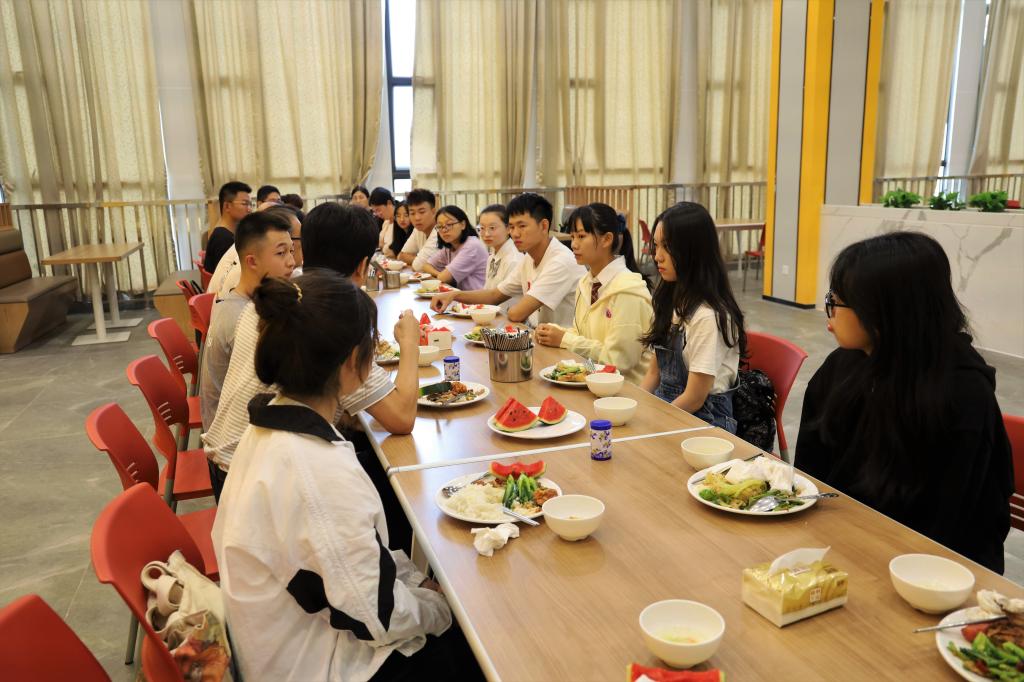 共进午餐,共话华商。10月12日中午,本学期第一次校长书记午餐会在四会校区举行。执行校长郭银华、党委书记苏宁、副校长王力东及相关职能部门负责人,在四会校区智慧餐厅与2021级新生代表亲切交流共进午餐。
