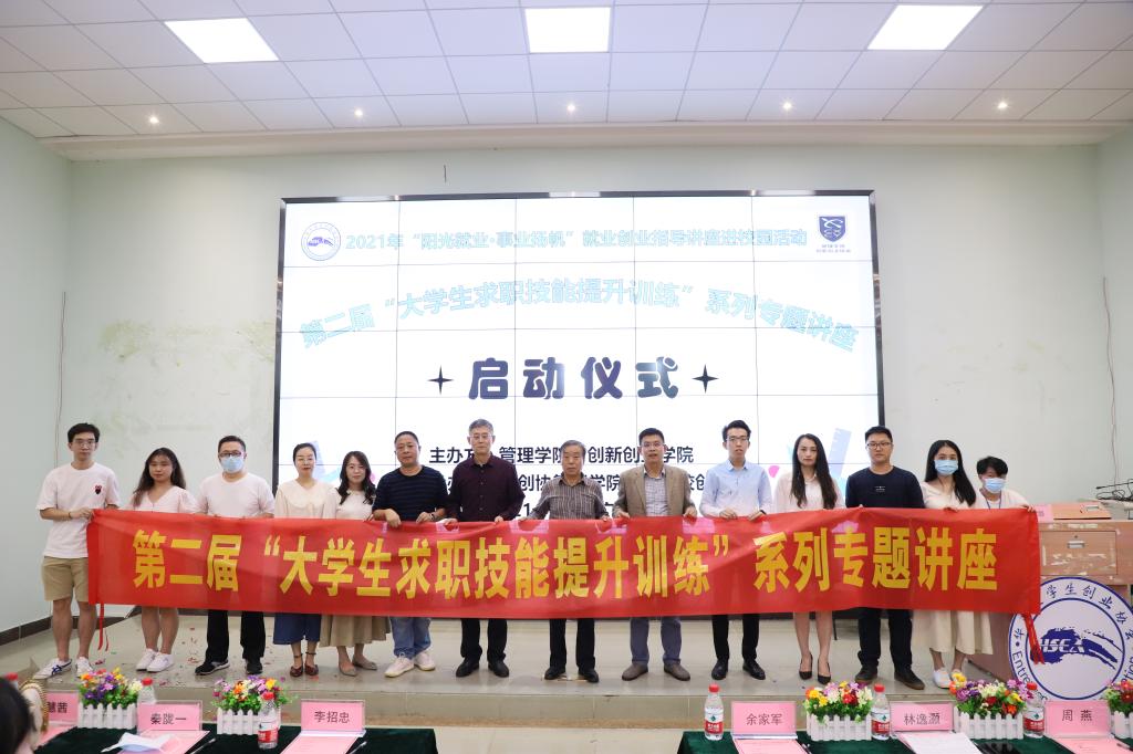 2021年10月19日,由管理学院与创新创业学院联合主办的2021年“阳光就业·事业扬帆”就业创业指导讲座进校园活动暨第二届“大学生求职技能提升训练”系列专题讲座启动仪式在励志楼C408举行。管理学院院长李招忠教授、副院长秦陇一教授、创新创业学院常务副院长兼管理学院副院长余家军副教授、创新创业学院办公室主任周燕老师,活动策划人管理学院杨剑老师、创新创业学院吴拯宪老师,创新创业学院谢根仁老师、陈欢老师,主讲嘉宾代表杨惠茜老师、廖梦玲老师、广州小黑科技有限公司CEO林逸灏先生等共计11人出席启动仪式。