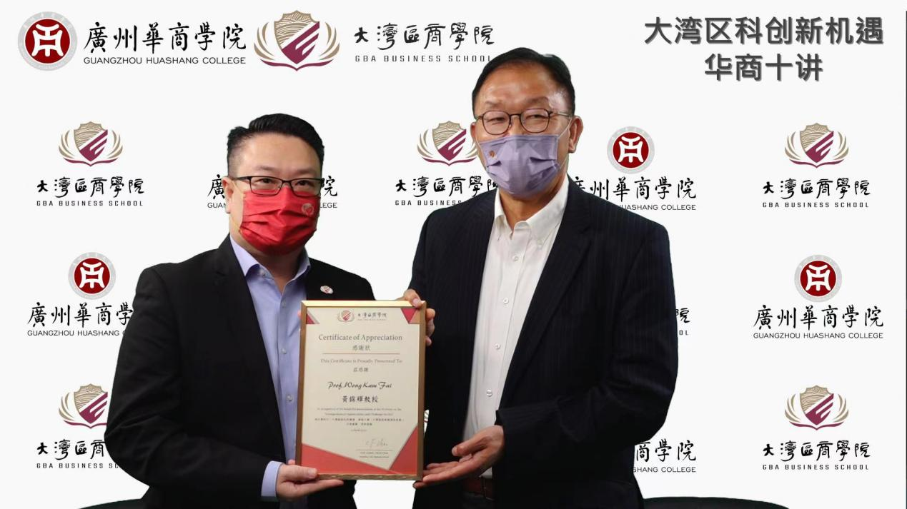 大湾区商学院副校长石义强(左)为香港中文大学工程学院副院长黄锦辉教授(右)颁发感谢状