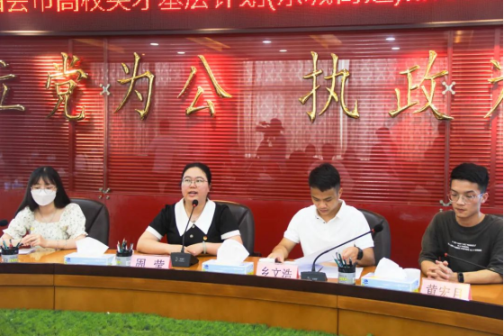 团四会市委副书记周莹发表讲话。她对大学生兼职团干表达殷切盼望,希望华商青年能够在基层实干中真抓实干、锻炼本领,在基层建设贡献青春力量。其余三位兼职团干代表先后陈述此次活动的见闻与收获。