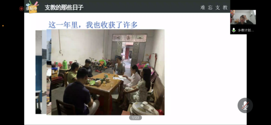 志愿者颜培珊也分享了她的支教故事。她说到,自己坚信“事在人为,境由心造”。在服务的过程中,她从温声细语、小家碧玉变成了可以张开双臂保护孩子们的好老师。与同学们亦师亦友,班级大树中学生们将她放在C位、班徽来源于她的名字。而她也积极解决孩子们的问题、做她们人生道路中的灯塔,做她们成长路上的知心人和领路人,指引前进的方向,为支教事业点亮希望的灯。