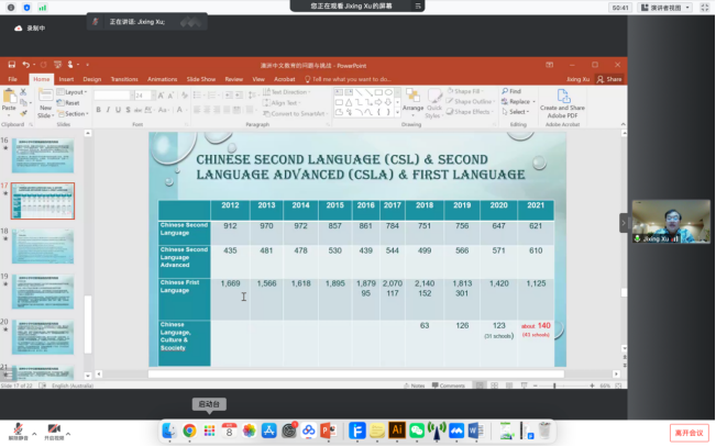 徐纪兴先生简要介绍了澳大利亚教育体系,并对比了中澳高等教育机构的异同。他还进一步讲解了汉语教育在澳大利亚中小学和高等院校的发展情况及成效等。徐纪兴先生结合自身的工作经验及研究成果,详细阐述了澳大利亚汉语教育目前遇到的一些问题。在澳大利亚,虽然中文是继英文之后第二大语言,在教学上取得一定成绩,但是受相关因素及疫情的影响,澳大利亚汉语教育缺乏专业人才,教材缺乏针对性和实用性,教学定位不够准确等问题明显。改进教学内容、方法、教材是当前国际汉语教育的重要议题。徐纪兴先生表示,未来希望能与华商学院紧密合作,共同探讨解决汉语国际教育事业所遇到的问题。