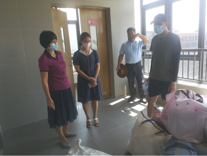 搬迁工作7月13日正式开始,王锦秀副校长与学校其他领导在管委会覃少冰副主任主任、段晓聪副主任、付蔚莹副主任的陪同下亲临学生宿舍关心行李搬运情况,协调行李搬运的流程及安排。