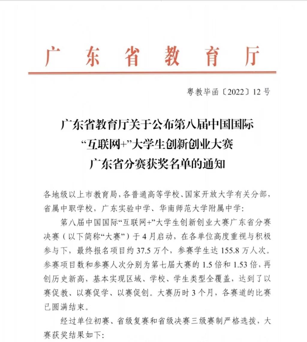 近日,第八届中国国际“互联网+”大学生创新创业大赛广东省分赛(粤教毕函【2022】12号)获奖名单公布,鸭脖《稚影传媒—融媒体世界领跑者》和《中健领航--多维度智慧校园综合解决方案》两个项目获省赛铜奖。
