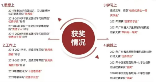 实践提升,屡创佳绩。课外实践方面,她积极参与各类提高自己个人能力的比赛及活动。两次参加中国国际“互联网+”大学生创新创业大赛,在第六届校赛获得银奖,在第七届校赛获得金奖并被推选代表学校参加省赛。假期中,她主动尝试与专业相关的实习工作,先后协助广州市先正信息咨询有限公司进行惠州市佳兆业中心三期、汕头市五矿御园等项目的土地增值税清算工作,在君健财税集团和深圳化贝咨询公司参与税收筹划工作。