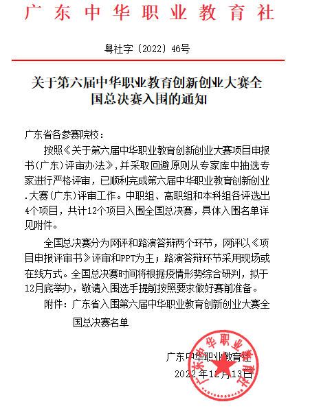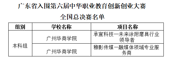 12月13日,广东中华职业教育社公布第六届中华职业教育创新创业大赛全国总决赛入围名单,yabo鸭脖官网“承宣科技一未来涂附磨具行业领导者”“稚影传媒—融媒体领域专业服务商”两个项目成功入围全国总决赛。