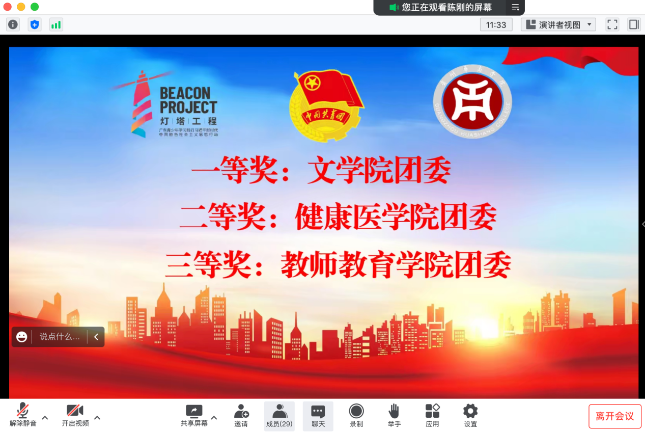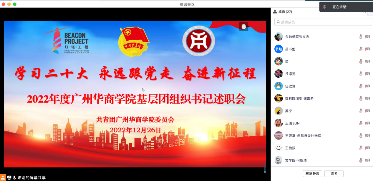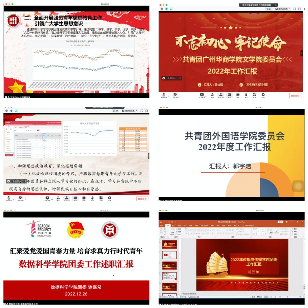 本次会议严格按照团中央、团省委关于基层团组织书记述职评议考核有关工作部署以及学校党委对共青团工作的具体要求。会议对鸭脖2022年共青团工作进行了系统的梳理和总结,为各学院借鉴交流、取长补短、明晰方向、共谋发展搭建了平台,同时也对2023年持续深化共青团改革创新进行部署。在今后的工作中,华商共青团将始终坚守初心使命,牢牢把握“加强思想政治引领”为根本,牢记“服务青年”的工作宗旨,做好学校联系广大青年学生的桥梁和纽带作用,加强共青团的“政治性、先进性、群众性”为工作目标,聚焦主责主业,拓宽工作思路,创新活动载体,全面推动共青团各项工作不断取得新成绩!