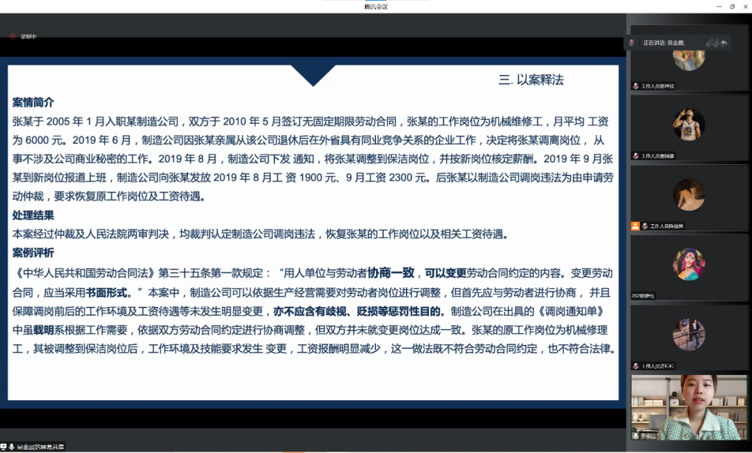 同时,她将法律知识和大学生常见法律问题紧密结合,把理论宣讲融入青年学生生活实际,帮助同学们更具象感知,在学习和工作中增强宪法意识,弘扬宪法精神。吴老师还抓住高校大学生等热点问题讲述案例,以通俗易懂、简单实用的语言解读现实典型案例及法律法条,以案释法、以法论事,为鸭脖学生开展一堂生动的法制课。