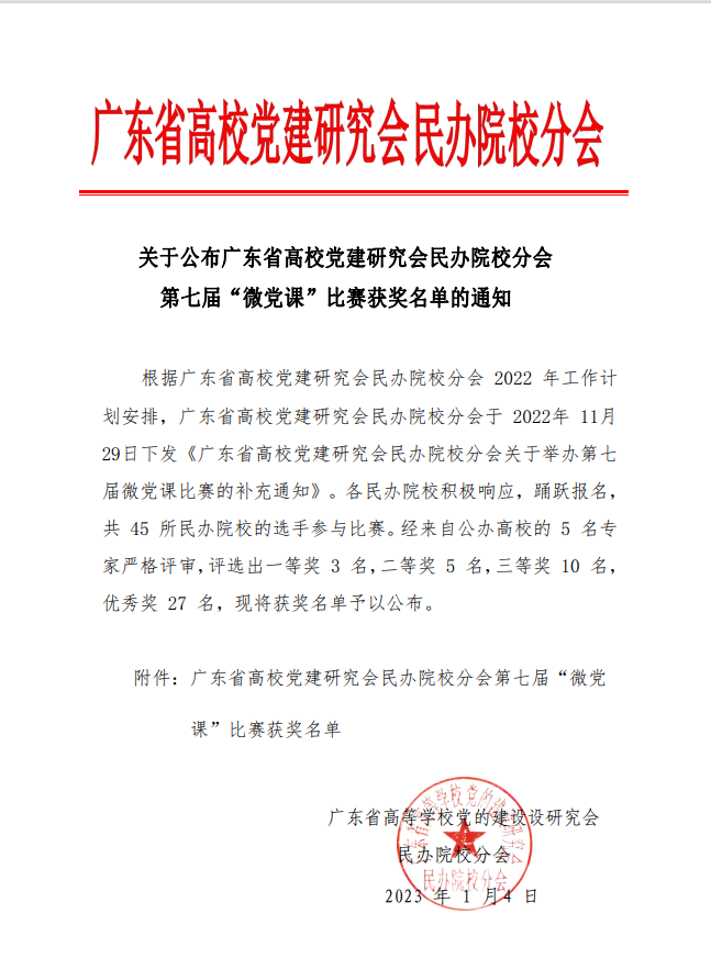 日前,广东省高校党建研究会民办院校分会公布了第七届“微党课”比赛获奖名单。其中,鸭脖陈刚老师荣获二等奖。