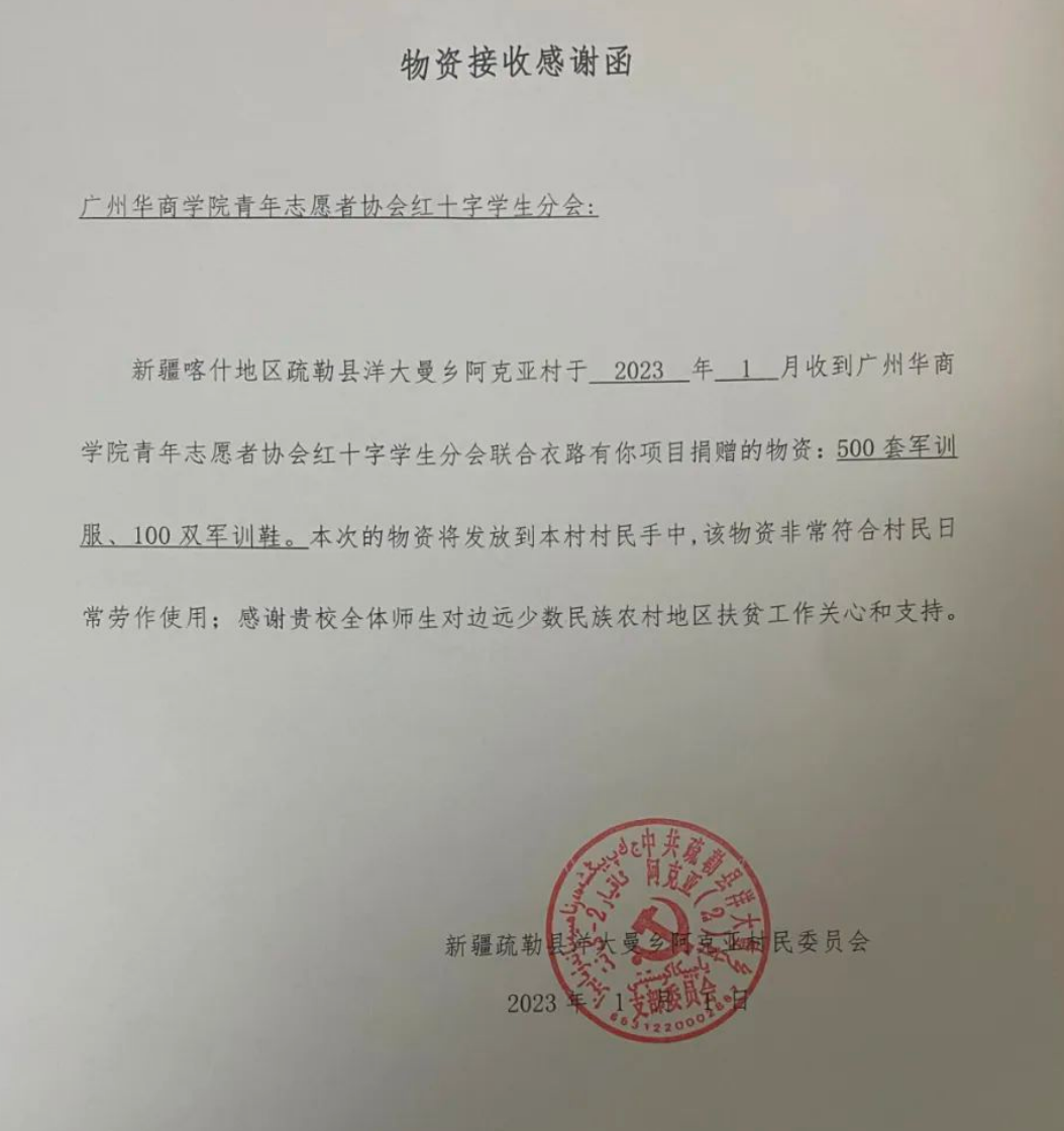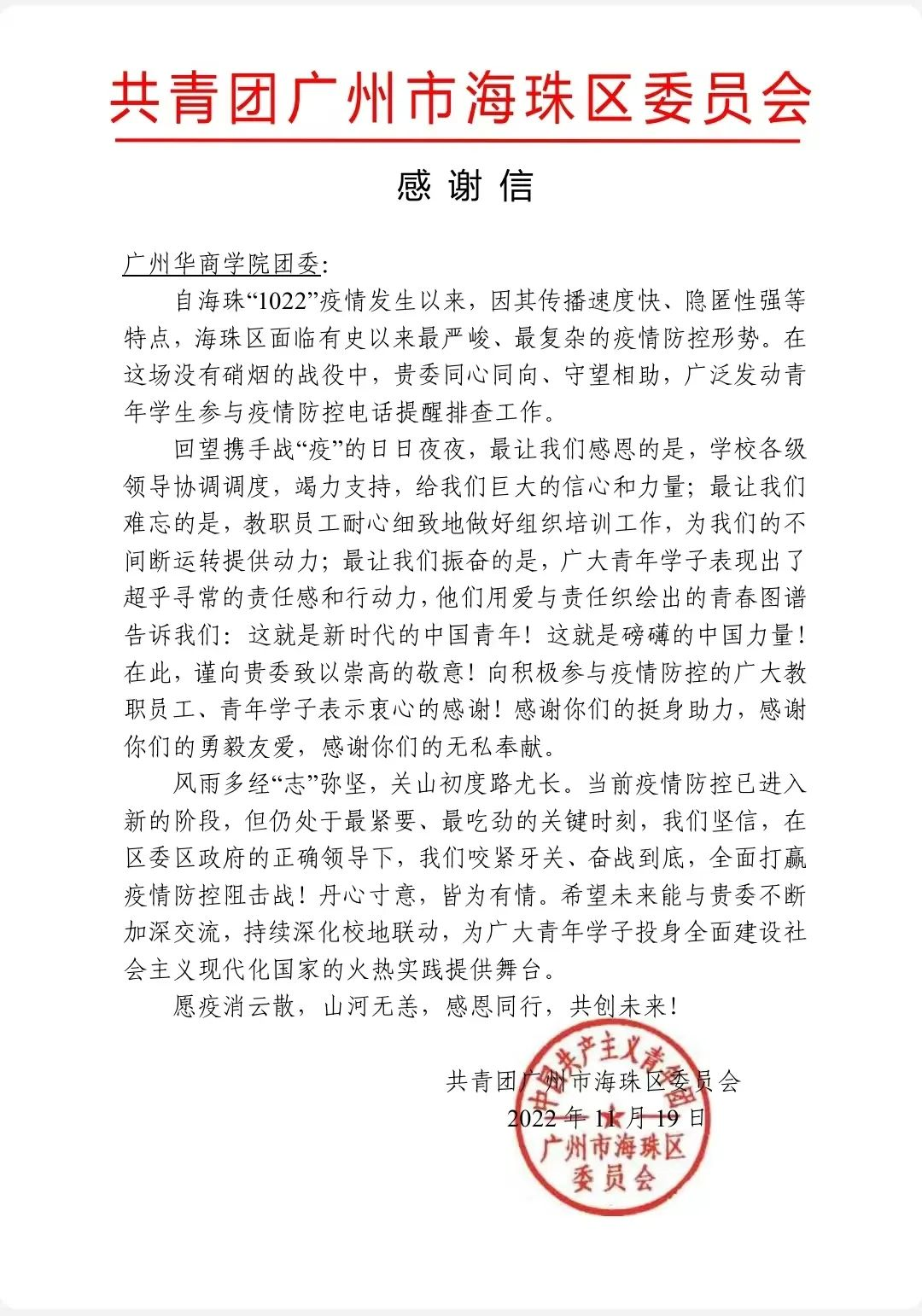 在学校党委的领导下,学校团委始终坚持引领华商青年学子深入学习贯彻习近平新时代中国特色社会主义思想,积极培育和践行社会主义核心价值观大力弘扬志愿精神,丰富志愿服务形式,在2022年交上华商青年答卷。近日,鸭脖团委收到了两份分别来自共青团广州市海珠区委员会以及新疆喀什地区疏勒县洋大曼乡阿克亚村的感谢信。
