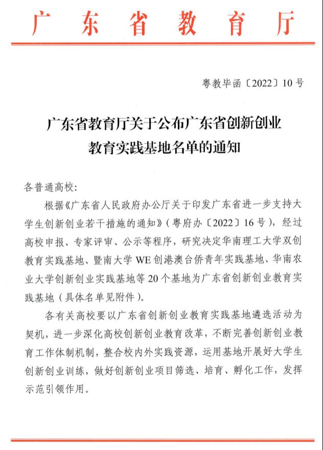 在全面深化创新创业教育改革过程中,学校注重学生实践能力培养,大力推进创新创业实践基地建设,依托广东华商众创孵化器有限公司运营华商大学科技园、梦想空间-粤港澳大湾区青年创新创业基地、华商众创孵化基地。2022年7月,梦想空间-粤港澳大湾区青年创新创业基地获批广东省创新创业教育实践基地,全省共有20个基地获批省级创新创业教育实践基地,其中民办高校仅有两所学校。