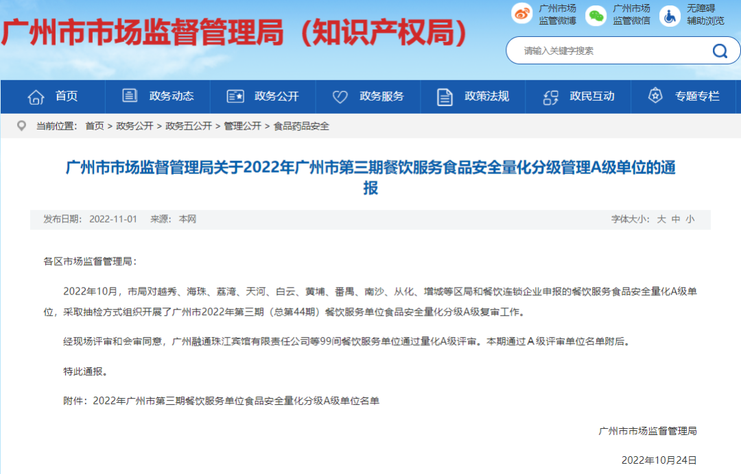 2022年10月,鸭脖(增城校区)第一食堂在集团和学校全面监督管理下,经过装修升级,进一步规范布局流程、强化监督检查、提升服务质量,通过了省、市、区市场监督管理部门多次严格检查,获得广州市局授予 “食品安全量化A级”称号。