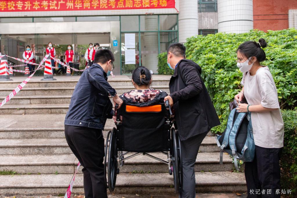 特别是看到一位行动不便坐着轮椅的考生时,志愿者和老师赶忙走上前去帮助她。根据她提供的考场信息,志愿者们一路护送该考生到达考场,还给了她很多鼓励和暖心的祝福。