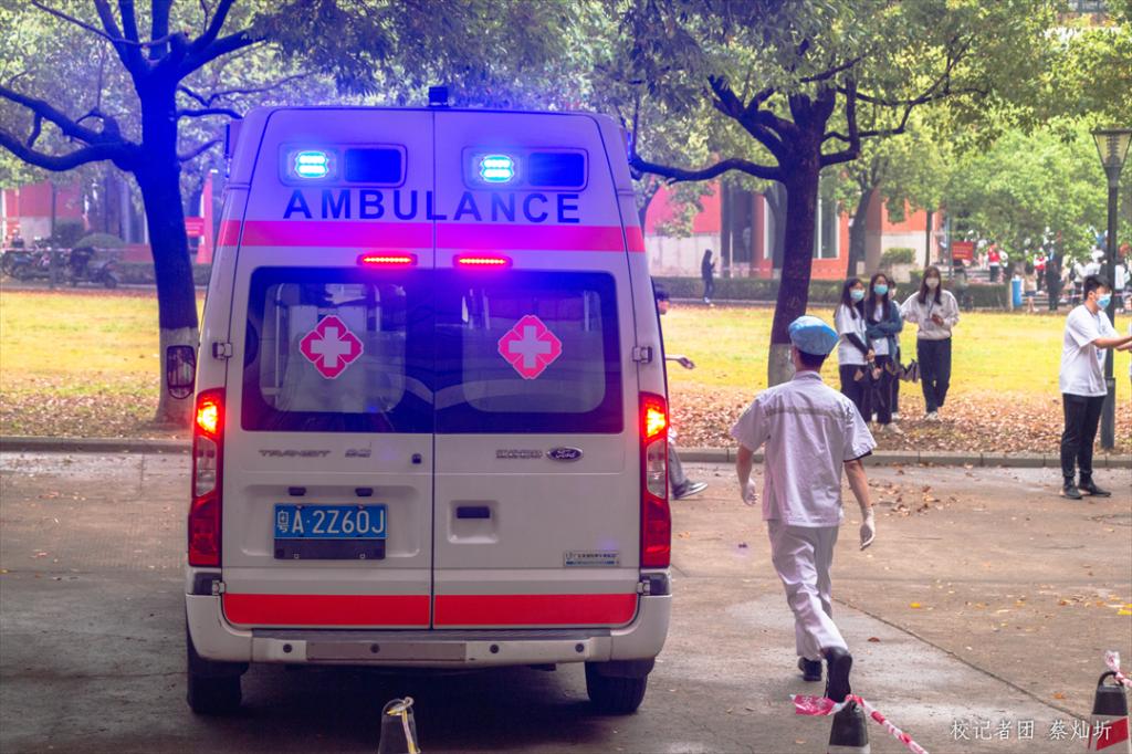 在现场,就有一名考生身体突发不适,出现了呕吐、缺氧等情况。医护人员知道后迅速赶到考生身边,耐心询问考生的不适,对她的病况进行了及时的处理。待考生舒缓一些后,医护人员又安排救护车送她去医院检查身体,进行下一步治疗。同时,学校也安排相关工作人员陪同该考生到医院诊疗,直至学生家长到达医院。