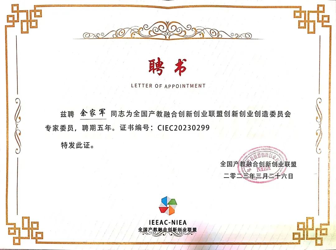 ▲余家军博士受聘为全国产教融合创新创业联盟创新创业创造委员会专家委员