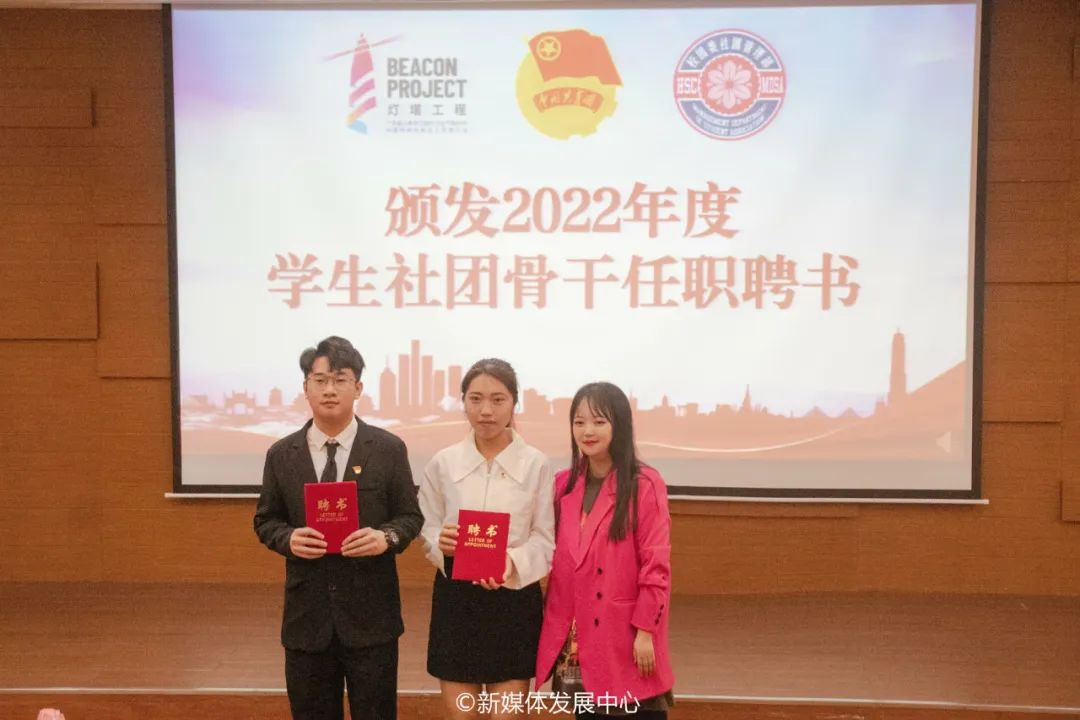 (学校党委宣传部刘苗部长为校团委社团管理部常委团成员颁发聘书)