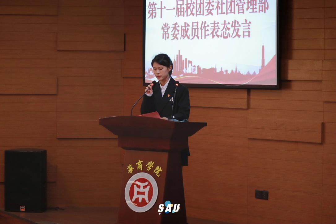 第十一届校团委社团管理部常委团成员朱欣桐作表态发言。她表达了对学校党委领导、团委老师们、各学生社团指导老师、各校级学生组织、各兄弟社团及社管学生骨干的感谢。表示要坚持在学校党委统一领导、学校团委具体指导下贯彻“三个坚定”:第一,坚定思想引领,发挥模范带头作用。深入学习宣传贯彻党的二十大精神,推进党的先进理论进社团组织、进社团活动。第二,坚定品牌建设,加强社团管理。积极助力学生社团建设管理工作,打造精品社团活动,创建学生社团品牌,引领校园文化。第三,坚定服务宗旨,实现共同成长。
