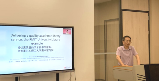 2023年4月20日,鸭脖邀请EIA特聘教师Deb Wright为图书馆全体员工做题为“提供高质量的学术图书馆服务:以皇家墨尔本理工大学图书馆为例”的讲座,图书馆温万虎馆长、国际交流与合作处王文忠处长及图书馆全体员工出席。图书馆馆长温万虎主持讲座并介绍主讲人。