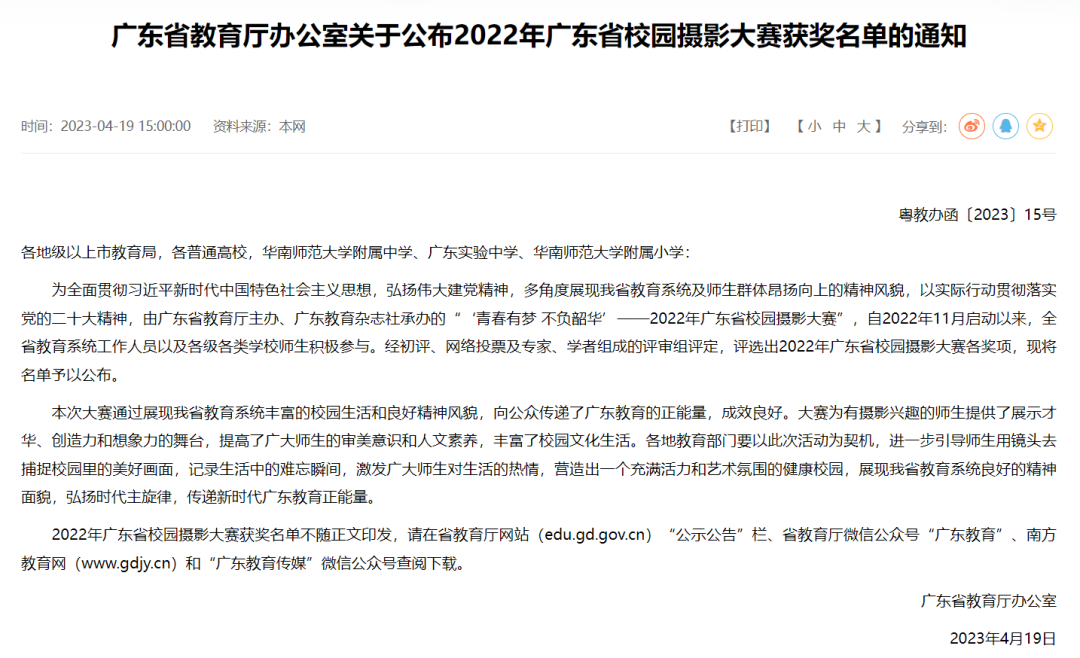 为弘扬伟大建党精神,多角度展现我省教育系统师生群体昂扬向上的精神风貌,以实际行动贯彻落实党的二十大精神,由广东省教育厅主办、广东教育杂志社承办的“‘青春有梦不负韶华’——2022年广东省校园摄影大赛”,自2022年11月启动以来,得到了全省教育系统工作人员以及各级各类学校师生积极参与。