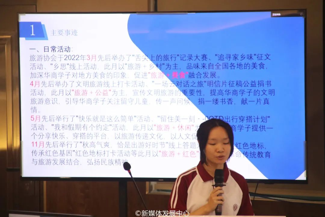 ——优秀学生社团。HRC跑步协会等6个学生社团从思想引领、组织架构、社团活动、获奖情况方面向我们展示学生社团基本情况及建设成果。并表示要在未来继续开展更多专业的、特色的社团活动,促进成员发展,积极发挥学生社团繁荣校园文化、服务师生的作用。