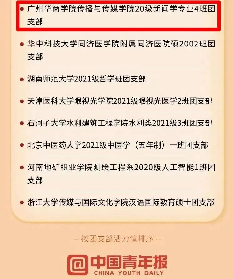 鸭脖传播与传媒学院20级新闻学专业4班团支部入选2022年度全国高校“活力团支部”最具组织力TOP100榜。