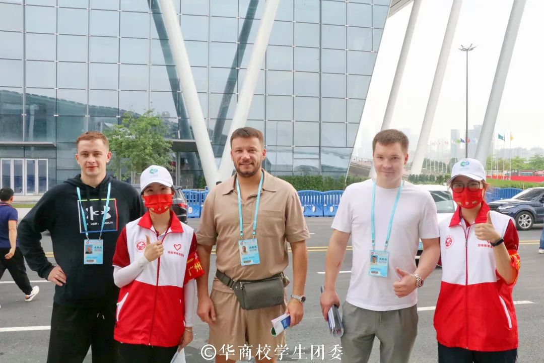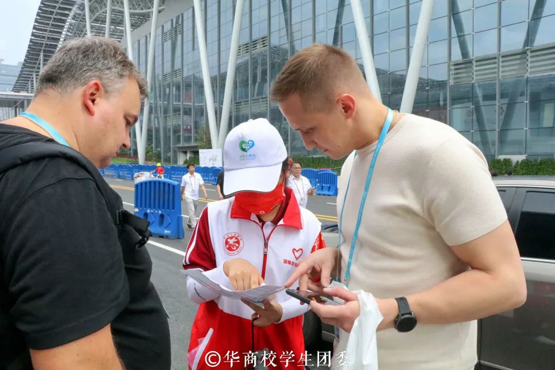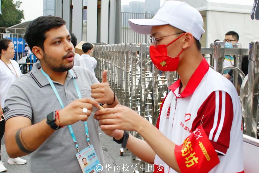 在校团委陈刚书记与夏仲老师的带领下,志愿者们顺利到达会场并参与岗前培训,迅速到各自岗位上开展志愿服务工作。鸭脖青年志愿者在严格落实疫情防控要求前提下,用青春汗水诠释志愿服务内涵,为国外客商提供语言翻译,场馆指引,办证咨询,交通疏导等贴心实用的志愿服务。