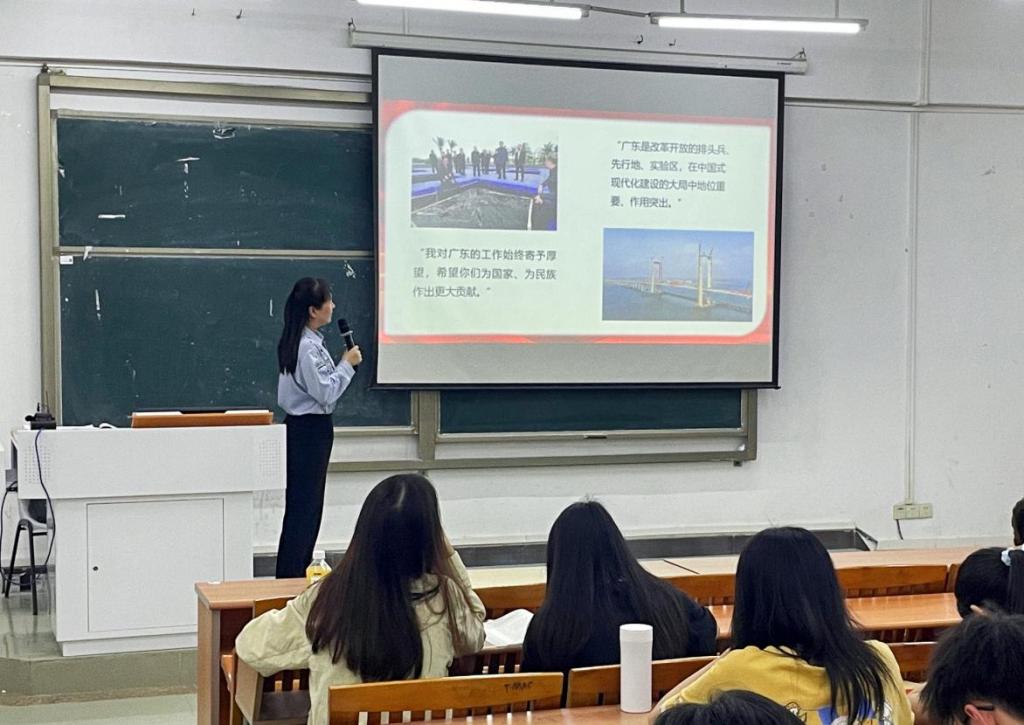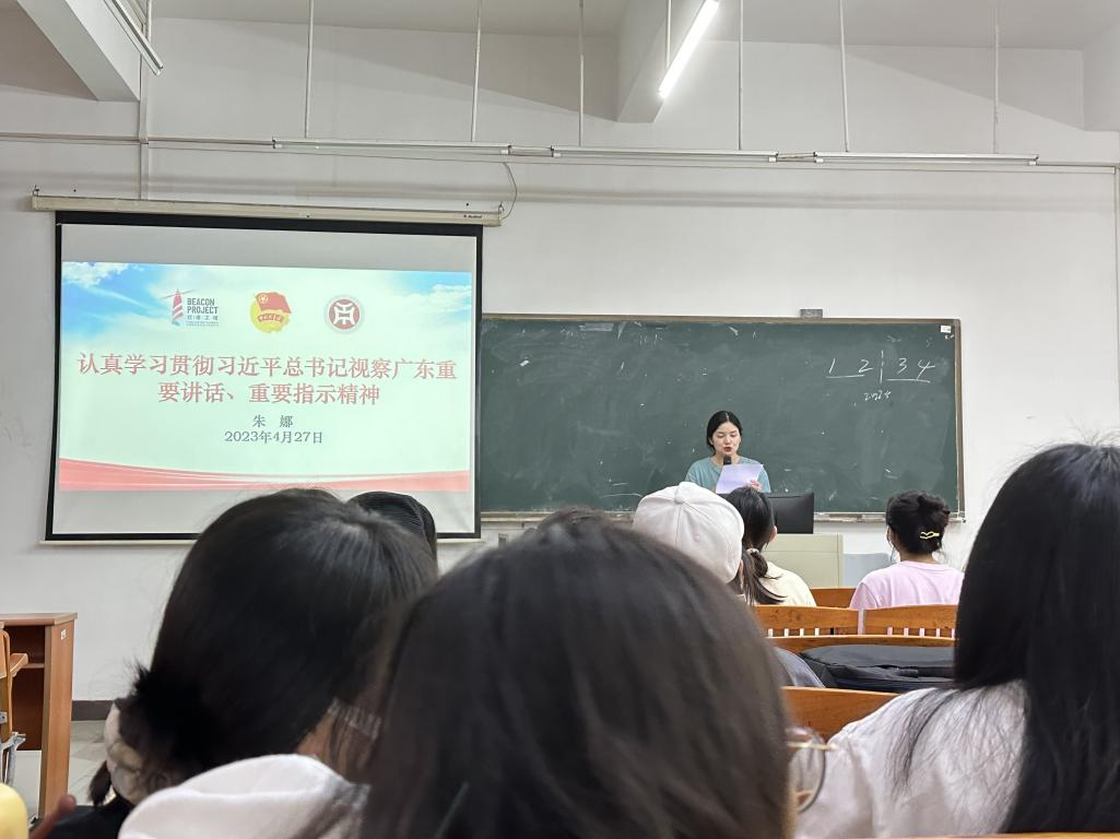 4月27日,教师教育学院团委书记朱娜、团委副书记杜范在增城校区和四会校区开展“认真学习贯彻习近平总书记视察广东重要讲话、重要指示精神”主题团课,为学院主要团学骨干授课。朱老师和杜老师强调,在全国上下深入学习宣传贯彻党的二十大精神的重要时刻,在新征程开局起步的关键节点,习近平总书记今年首次国内视察就来到了广东,足见习近平总书记对广东发展的殷切期望、对广东人民的深情牵挂。作为新时代青年学生骨干,要持续学深悟透习近平总书记重要讲话重要指示精神,要在学习和工作中注重运用,切实服务师生,增强广大青年的向心力、凝聚力和号召力,在全面推进中国式现代化建设中作出展现新担当、实现新作为。