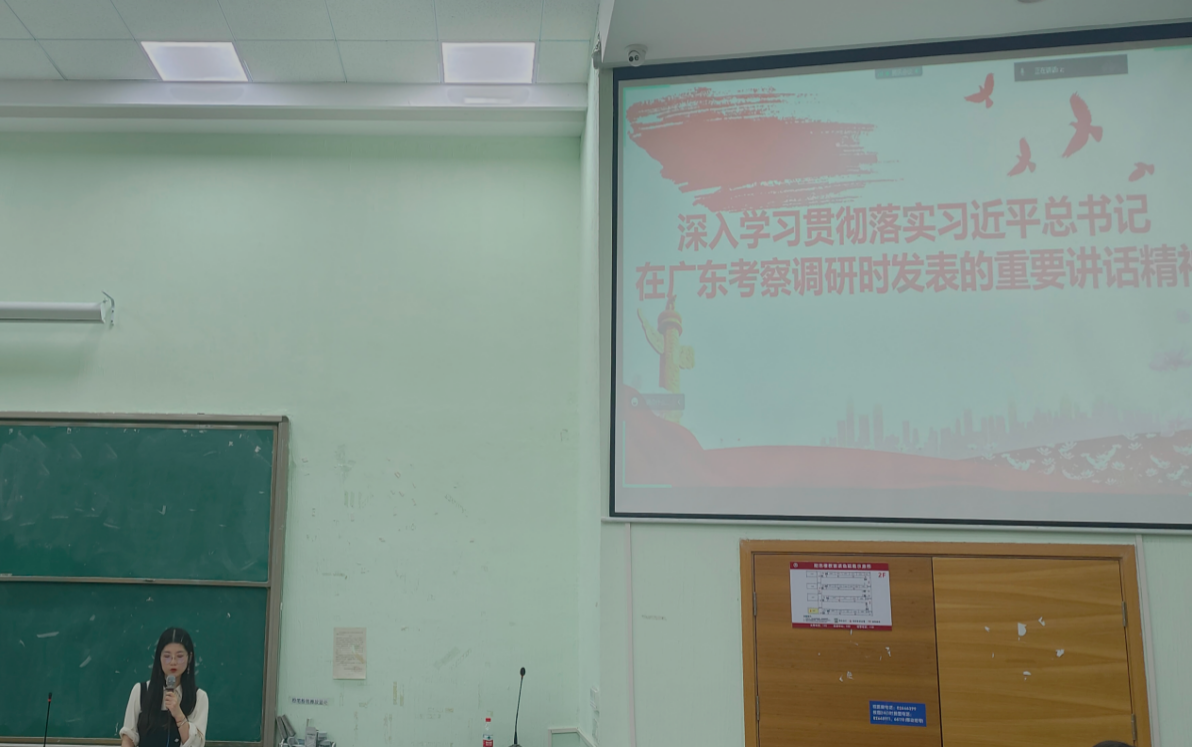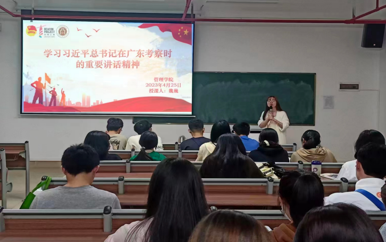 4月25日,管理学院团委在双校区面向学院青年团员开展了以“认真学习贯彻习近平总书记视察广东重要讲话精神”为主题的团课。学院团委书记江思号召管理学院的团员青年要积极学习贯彻习近平总书记视察广东重要讲话、重要指示精神,在日常生活中刻苦学习、积极进取,时刻明确作为新时代青年身上肩负的使命和担当,毫不动摇地听党话跟党走。学院团委副书记魏巍强调学习习近平总书记视察广东重要讲话精神意义重大,同学们要认真深刻领会习近平总书记视察广东重要讲话精神的丰富内涵和精神实质。学生会指导老师徐煜忻指出,在全面贯彻落实党的二十大精神开局之年,习近平总书记把第一次地方调研定在广东,并发表重要讲话、作出重要指示,有重大深远的战略考量。管理学院青年要牢记嘱托,立志民族复兴,不负韶华,不负时代,不负人民,争取跑出当代青年的最好成绩!