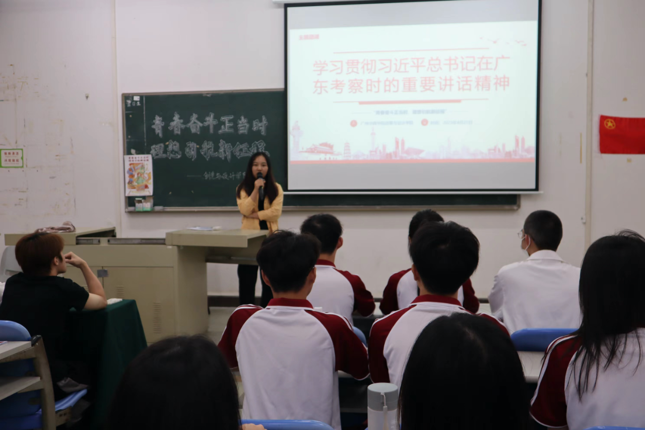 4月27日,创意与设计学院团委在励志楼B504组织开展“学习贯彻习近平总书记在广东考察时的重要讲话精神”主题团课,团委书记蔡舒授课,团学组织工作人员、各班团支书和团员代表参与本次课程。蔡老师强调,广大学生骨干要切实深入学习贯彻总书记重要讲话、重要指示精神,深入领会其丰富内涵、精神实质、实践要求和理论品格,自觉用以统一思想、统一意志、统一行动,坚定沿着总书记指引的方向继续前行。四会校区的主题团课由副书记王容章老师组织开展。王老师强调,同学们要主动承担使命,学深悟透,指导实践,以实际行动全力推进学习宣传贯彻习近平总书记重要讲话重要指示精神走深走实、落地见效。