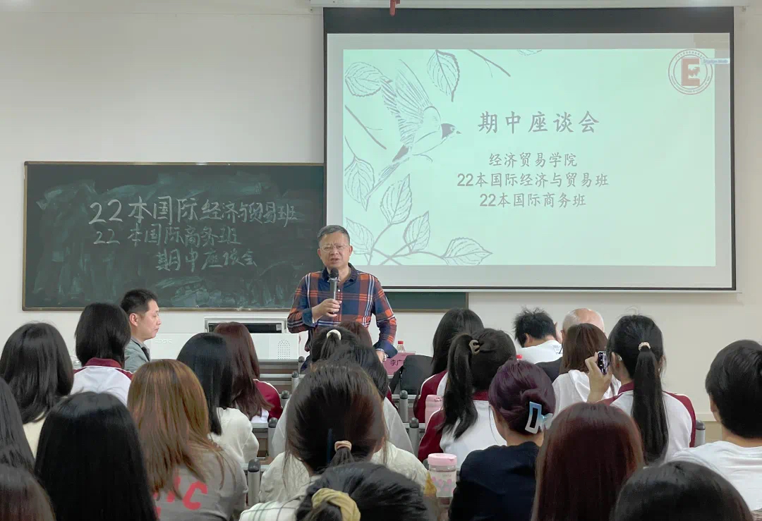 为深入开展学习贯彻习近平新时代中国特色社会主义思想主题教育,坚持立德树人初心,牢记为党育人、为国育才使命,促进经济贸易学院班风学风建设,深入了解四会校区经贸学子的学习情况与校园生活状态,经济贸易学院李广明院长率学院院长助理石立副教授、学工办主任宋元跃老师、各系负责人和教师代表于2023年5月9日前往四会校区,在22级国际经济与贸易班、跨境电商班、国际商务班、经济统计学班分别召开期中座谈会。