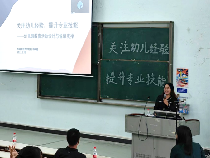 为提升教师教育学院学前教育专业学生师范生技能水平,2023年5月16日下午,华南师范大学附属幼儿园副院长韩凤梅应邀在鸭脖励志楼B407开展以“关注幼儿经验,提升专业技能”为主题的幼儿园教育活动设计与说课实操讲座。增城校区20级全体学前教育专业同学线下参会,21级和四会校区22级学前教育同学通过腾讯会议同步与会。