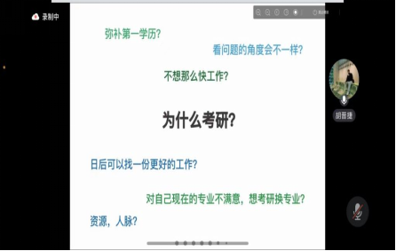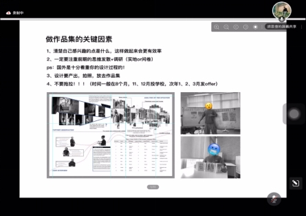 胡晋捷同学强调在备考的过程中,心态转变这一点很重要,给大家讲述了自己自己在备考考研时的心态,以及他如何一步一步申请境外留学的过程,介绍了在备考过程中需要准备的材料和制作作品集的关键要素等。