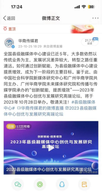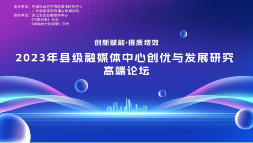 10月28日上午9时,2023年县级融媒体中心创优与发展研究高端论坛在增城宾馆隆重举行。本次论坛由中国社会科学院新媒体研究中心和yabo鸭脖官网共同主办,浙江省安吉县融媒体中心、《中国记者》杂志社和《媒体融合新观察》杂志社协办,传播与传媒学院新媒体中心承担本次高端论坛的传播工作。