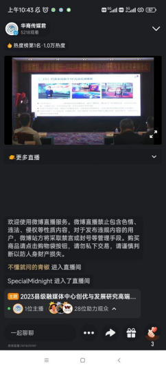传播与传媒学院官方微博“传媒君”同步视频直播论坛盛况。本次活动视频直播热度长期位居热度榜前三,一度占据首位!截止到发稿时,本次活动相关微博阅读量累计已达23万+,直播视频观看用户1.7万+,两项数据均创“传媒君”同类型活动数据历史新高!