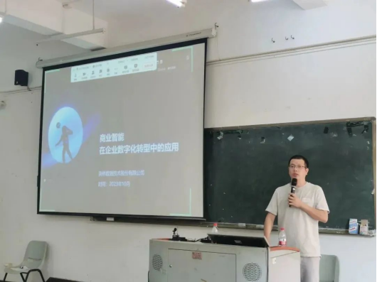 潘老师凭借其近十年的行业从业经验及对产业的洞察,从大数据产业的发展历程、应用场景、技术发展趋势以及行业应用现状等多个角度,详细阐述了“产业数字化转型背景下商业智能的应用价值”。他从大数据技术赋能产业应用的角度,详细介绍了相关数据分析知识、技术与工具如何在产业发展中帮助企业提升经营决策水平,以生动的语言和系统的讲解,帮助学生了解产业发展趋势,从而对产业应用场景建立更加清晰的认知。
