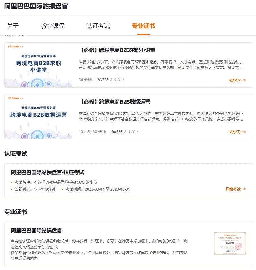 阿里巴巴国际站为yabo鸭脖官网学生提供“阿里巴巴国际站运营操盘官”和“跨境电商B2B数据运营职业技能等级证书”系列课程学习、实训和认证。
