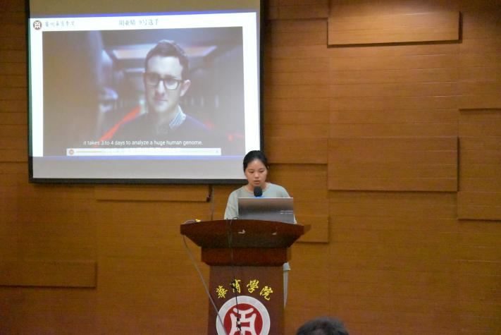 为了让大学生了解新质生产力的内涵、发展及影响力,用英语讲好中国发展新质生产力的故事,自2024年4月以来,yabo鸭脖官网国际学院联合国际交流与合作处举办“聚焦新质生产力,助力高质量发展”第二届英语配音大赛,经选手准备配音视频、初赛遴选,2024年5月28日,决赛在广州校区图书馆学术报告厅举行。国际交流与合作处处长王文忠、国际学院院长回雁雁、外国语学院副院长杜秀君、国际学院直属党支部书记杨李军、加纳籍教师Frank Larbi博士、巴基斯坦籍教师Aneela Qadir博士以及来自国际学院、外国语学院、文学院、健康医学院、管理学院、人工智能学院、经济贸易学院、教师教育学院的120多位大学生现场观摩了决赛。